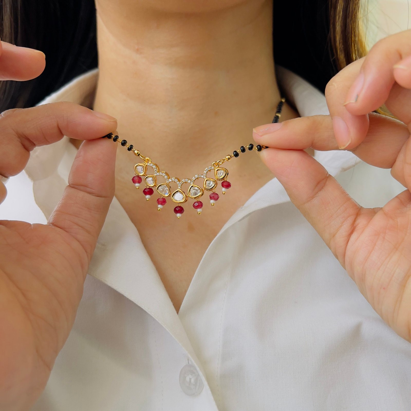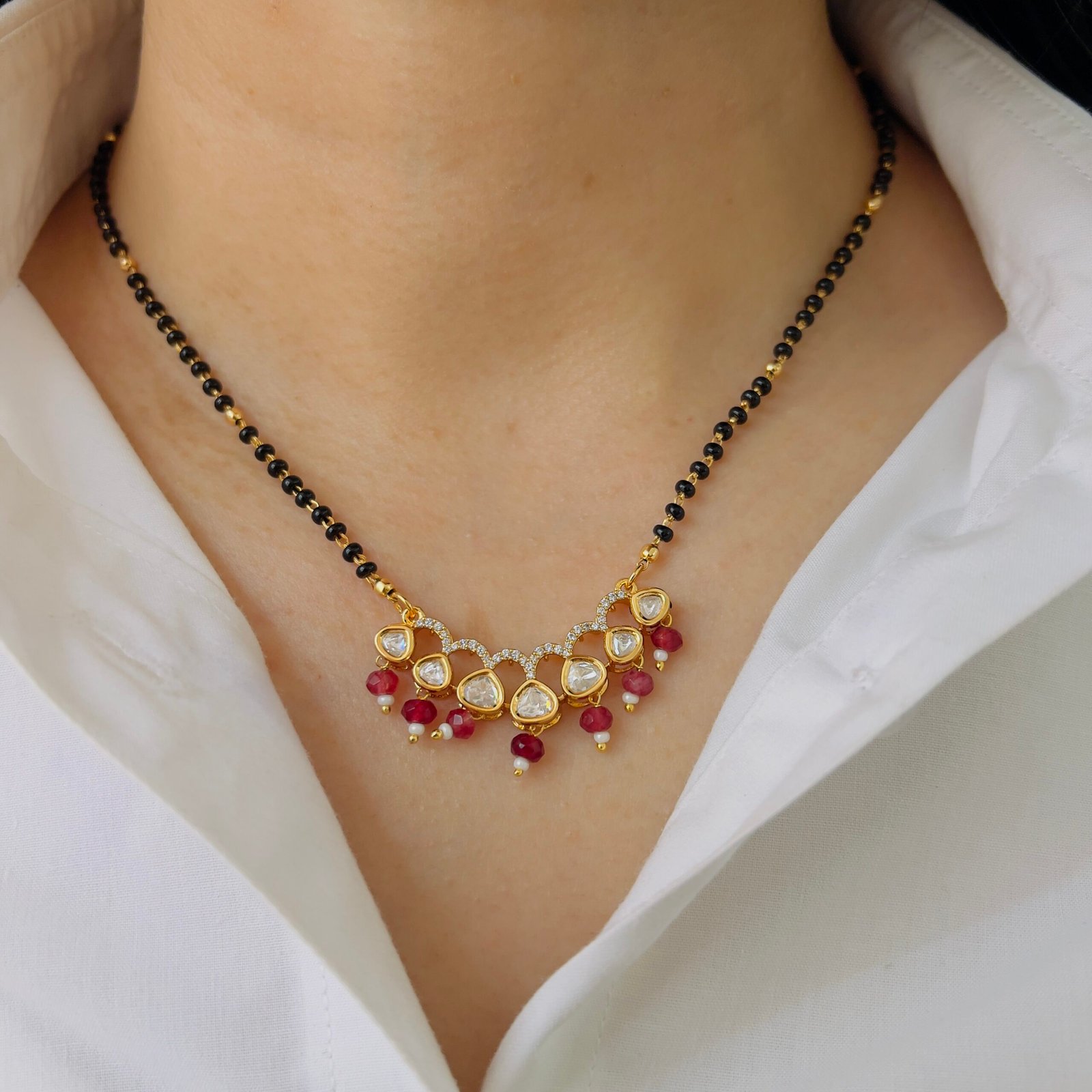 Lightweight yet durable, this 18K gold plated mangalsutra is anti-tarnish and made for rough use, Its shiny stones give a radiant finish to your daily look.