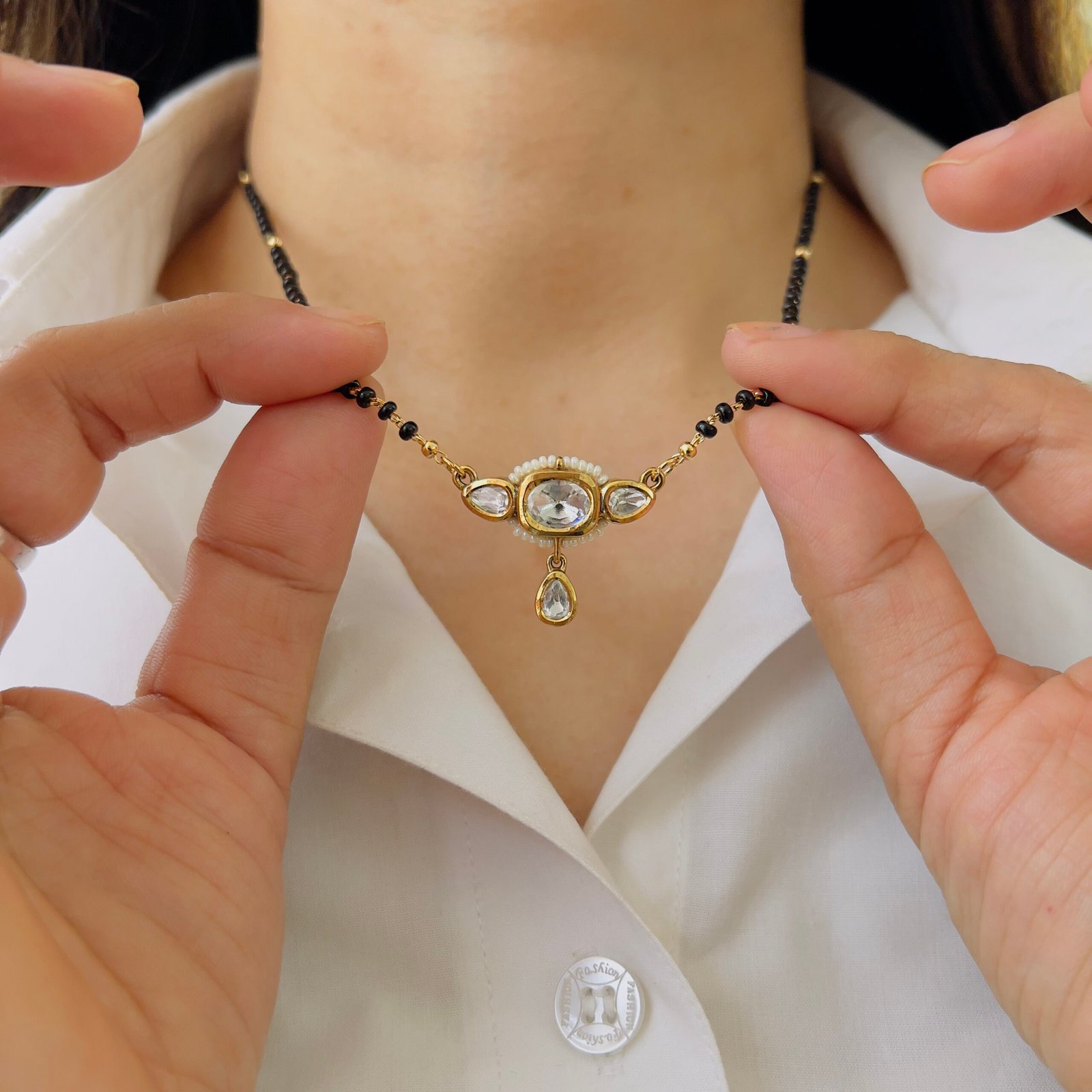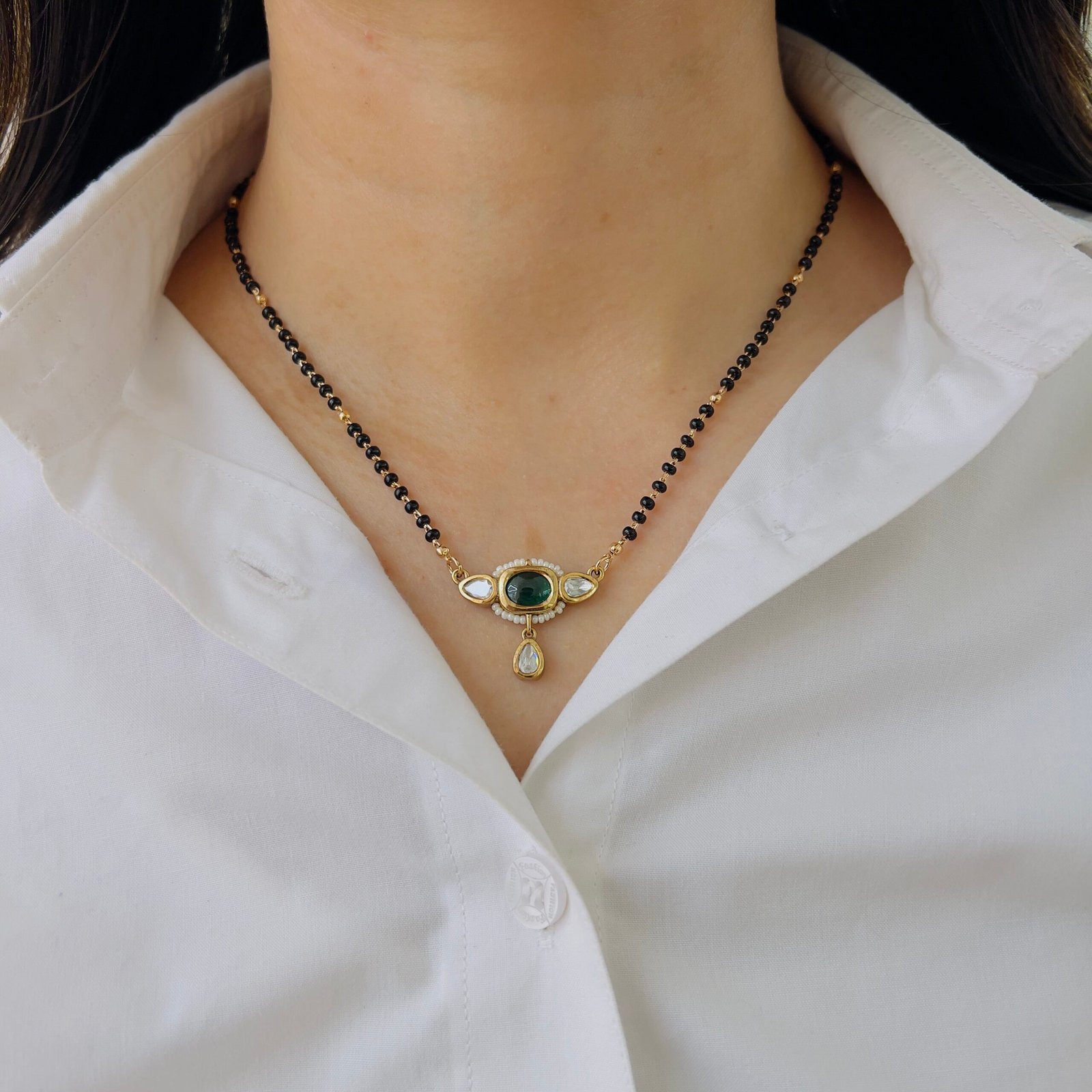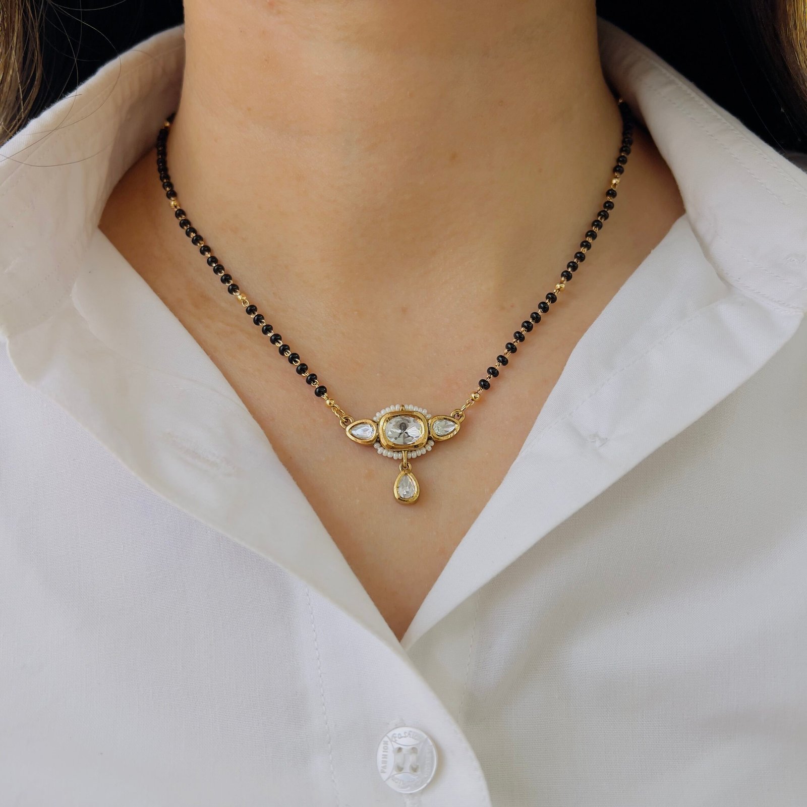 This 18K gold plated mangalsutra combines classic charm with durability, Shiny stones, anti-tarnish coating, and rough-use quality make it ideal for daily elegance.