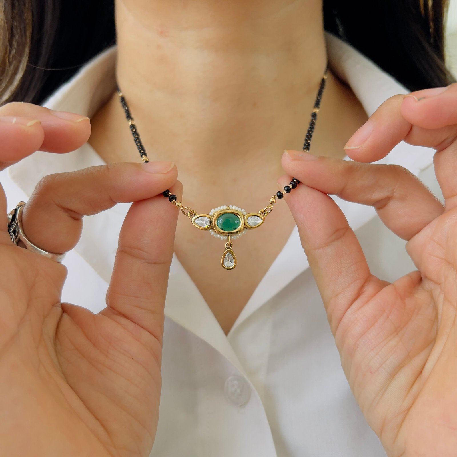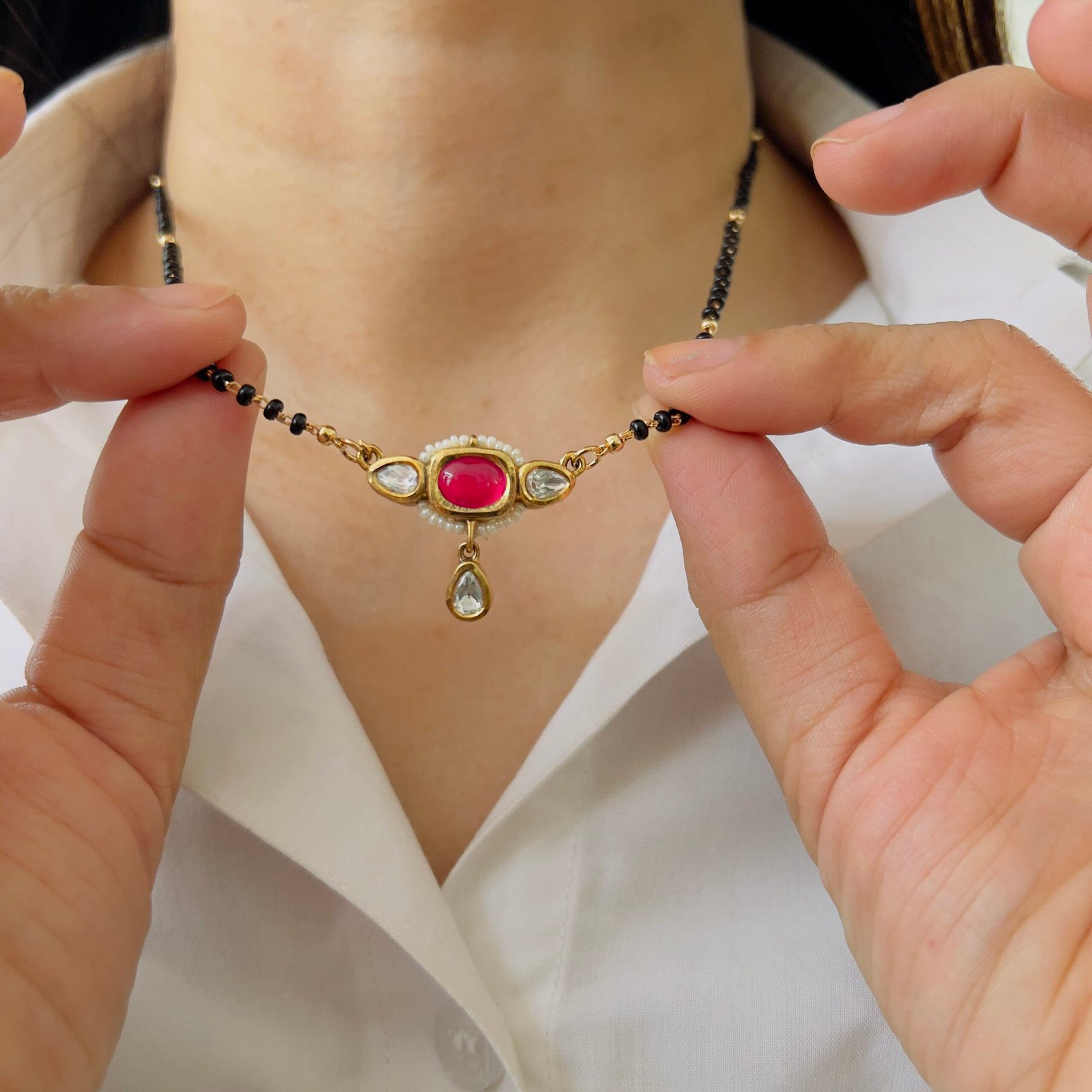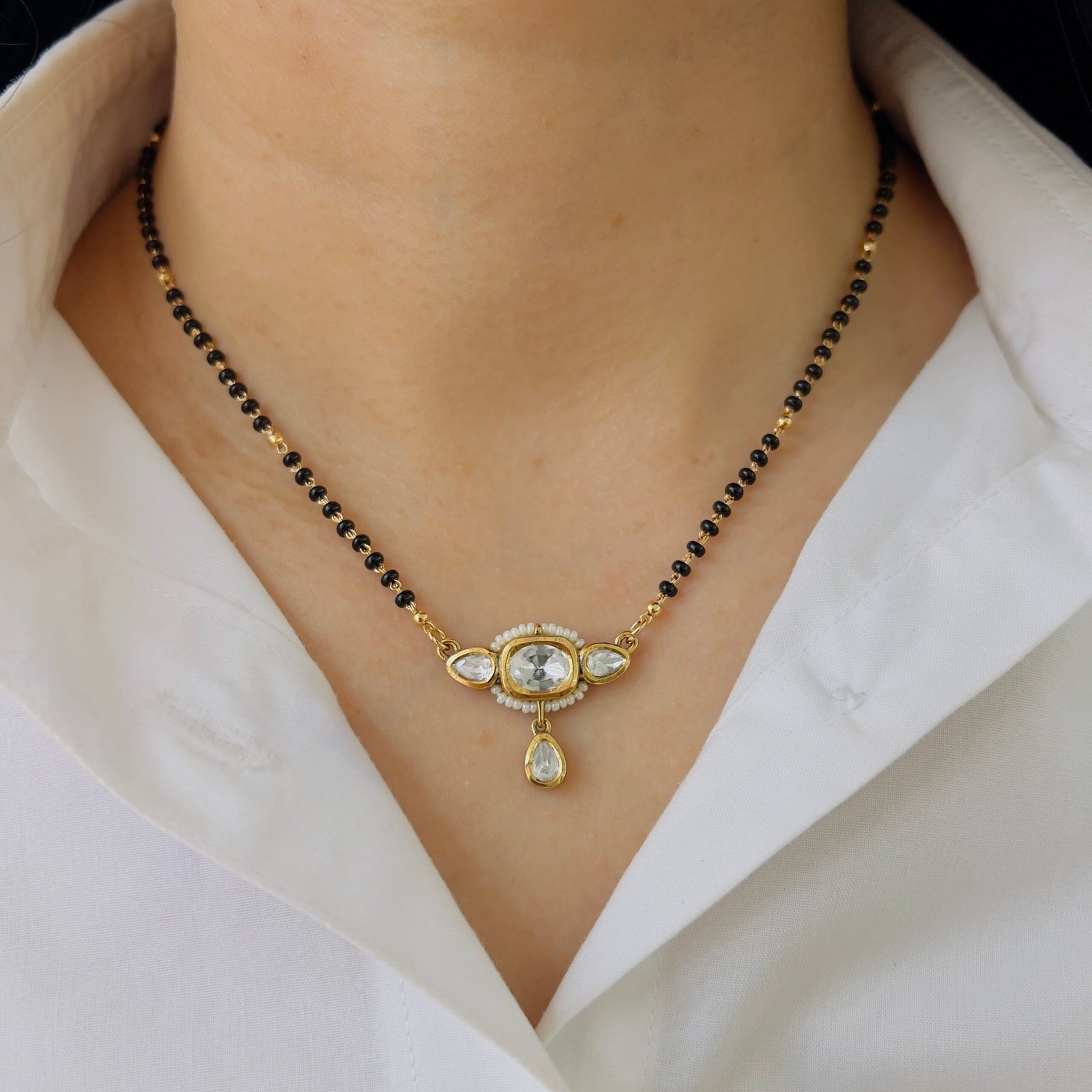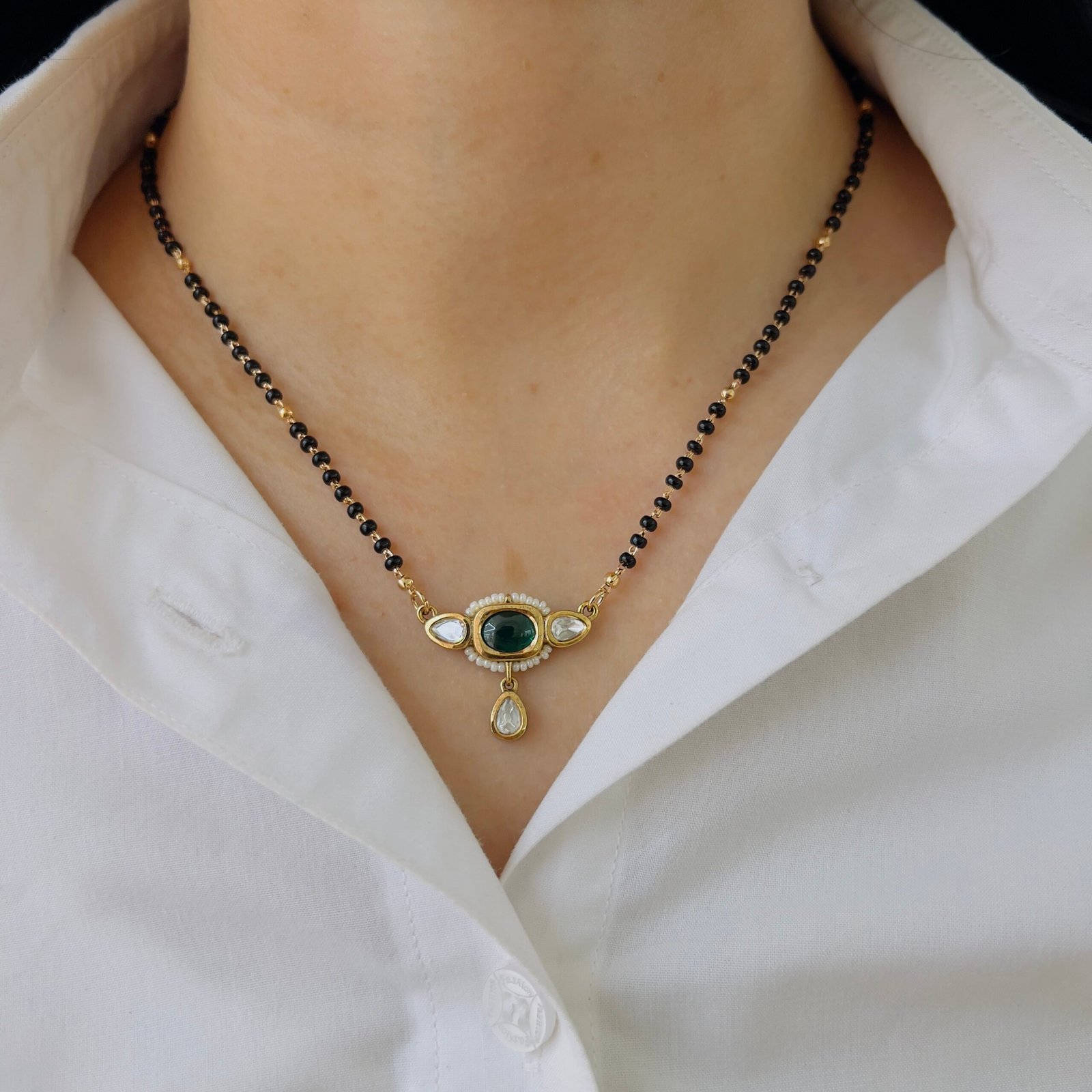 This 18K gold plated mangalsutra combines classic charm with durability, Shiny stones, anti-tarnish coating, and rough-use quality make it ideal for daily elegance.