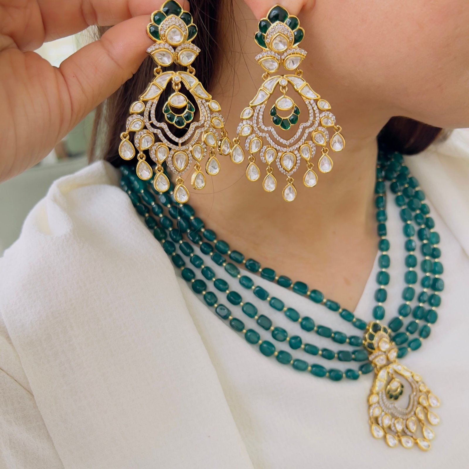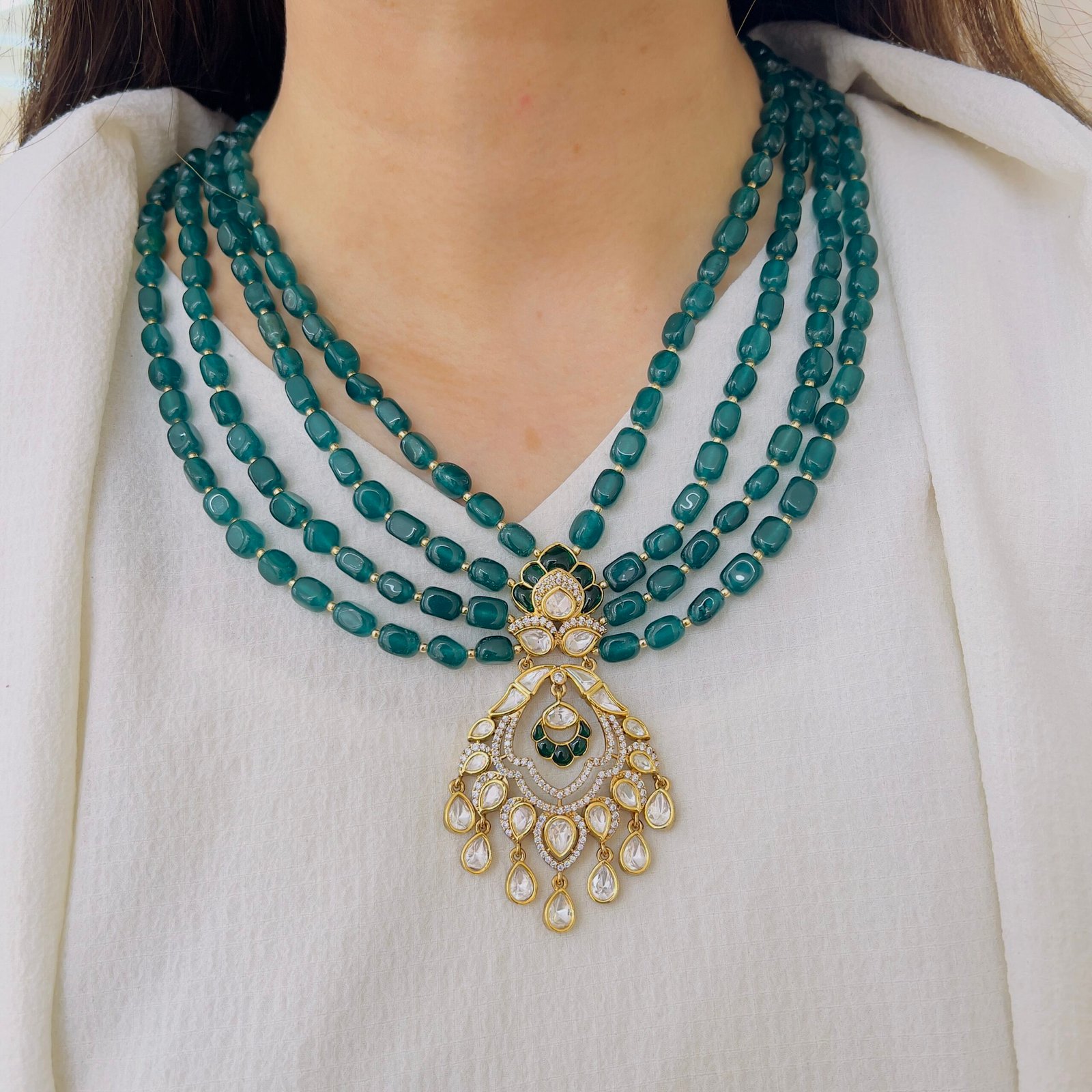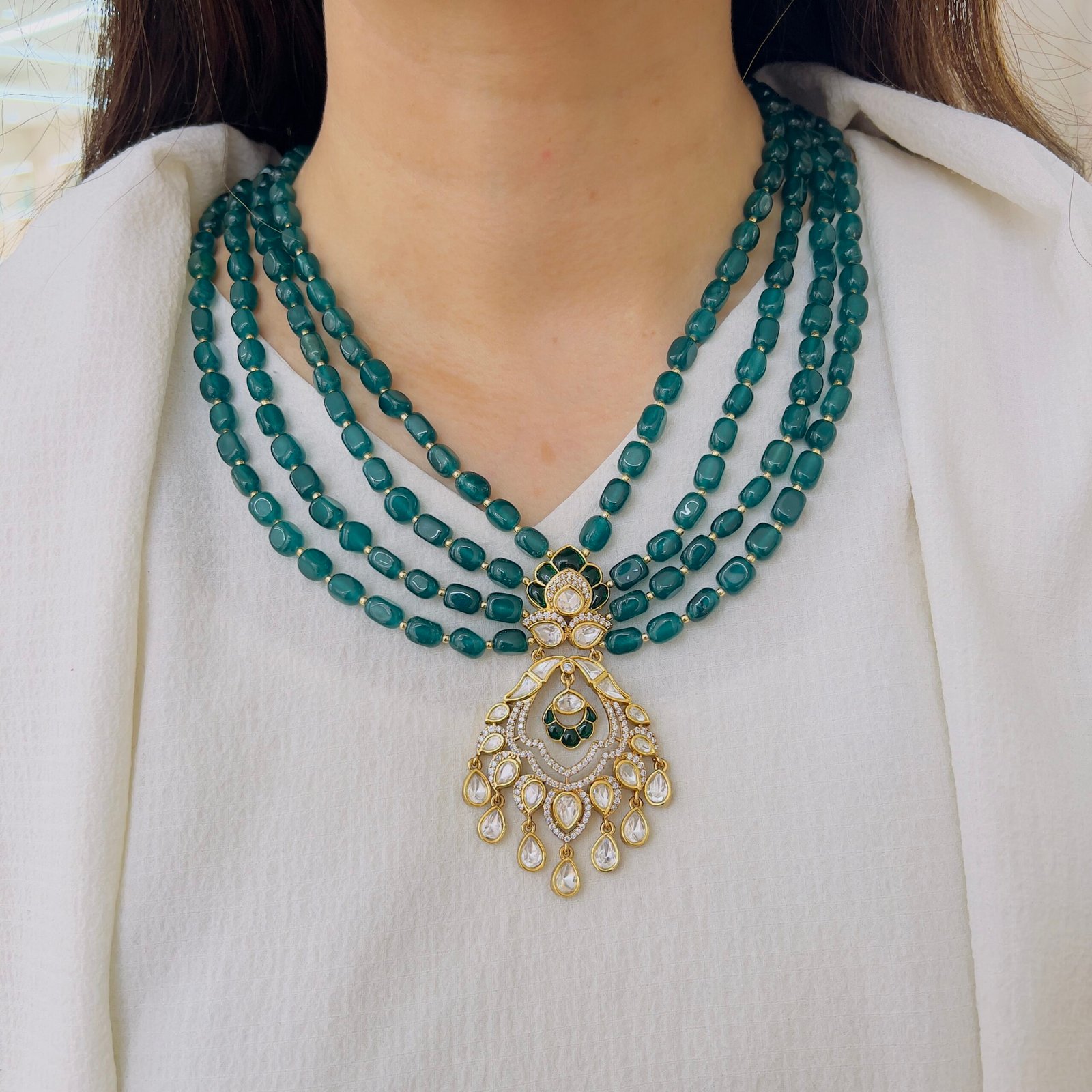 Teal Onyx Four-Strand Mala with Grand Polki Chandbali Pendant
