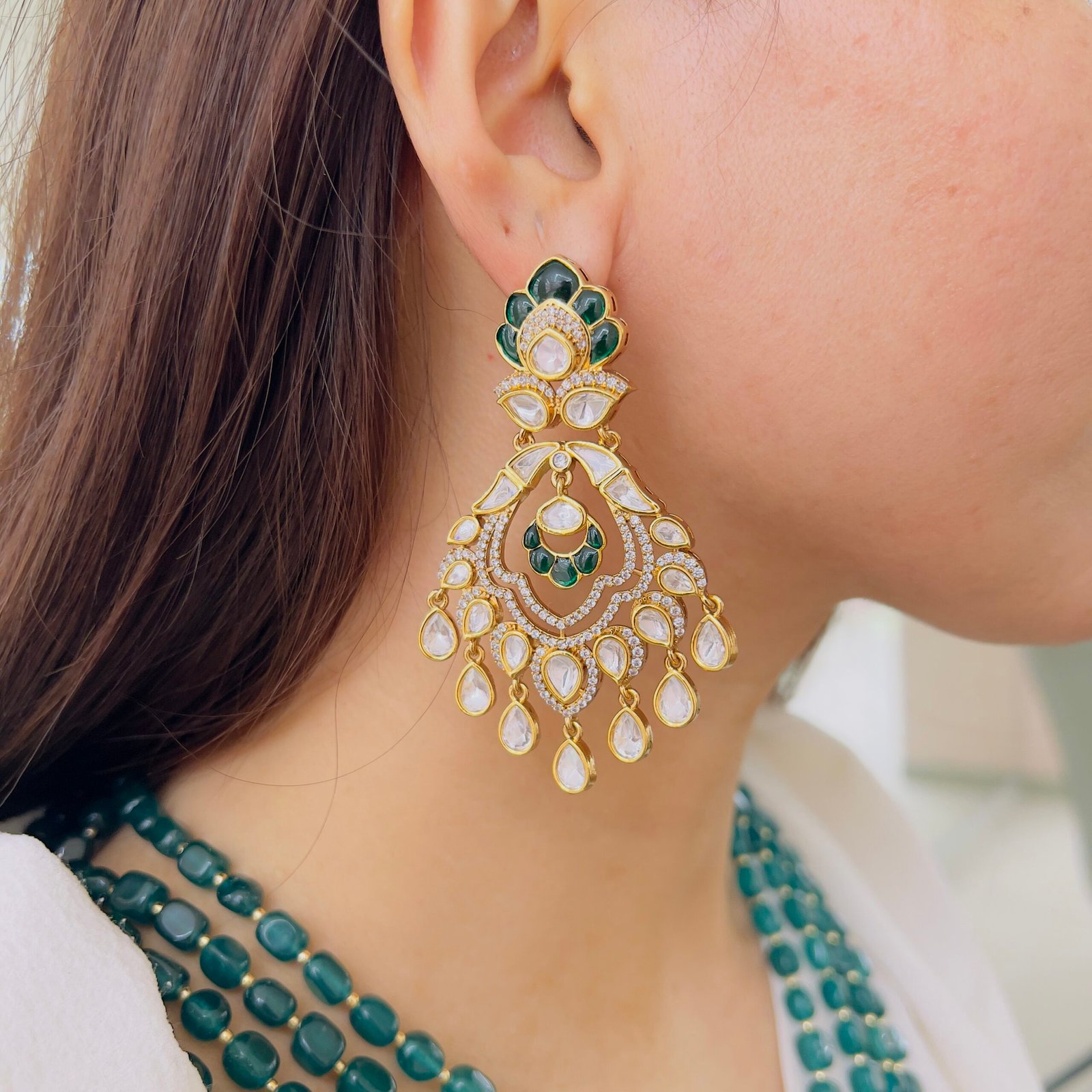 Discover the epitome of Nawabi elegance. This stunning set features four rows of premium teal-green onyx beads, curated for their rich color and smooth finish. The necklace is anchored by a magnificent gold-toned Chandbali pendant, meticulously handcrafted with uncut Polki stones and shimmering accents, With matching oversized statement earrings, this set is designed for the modern bride or the guest who loves to embrace heritage luxury at every festive occasion.
