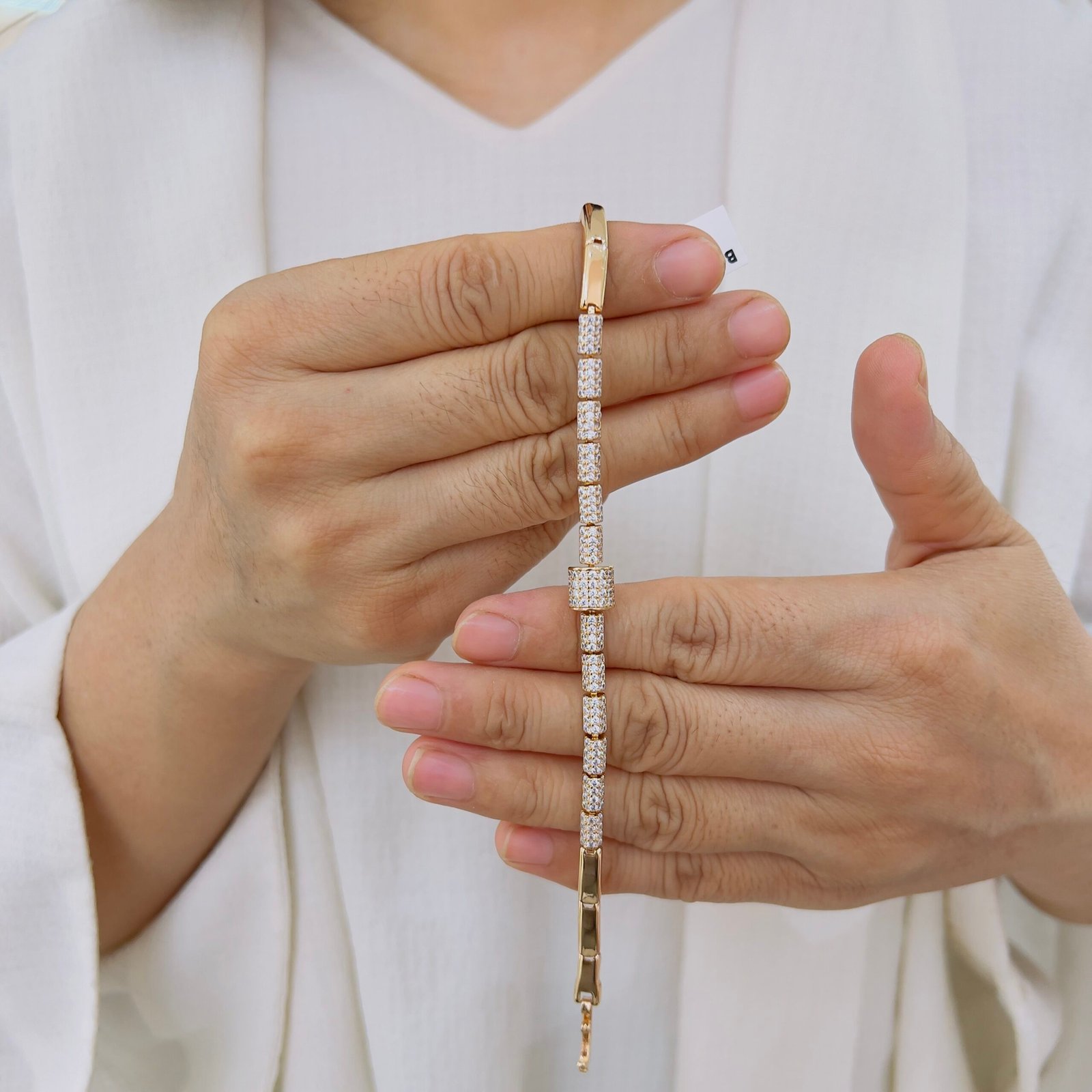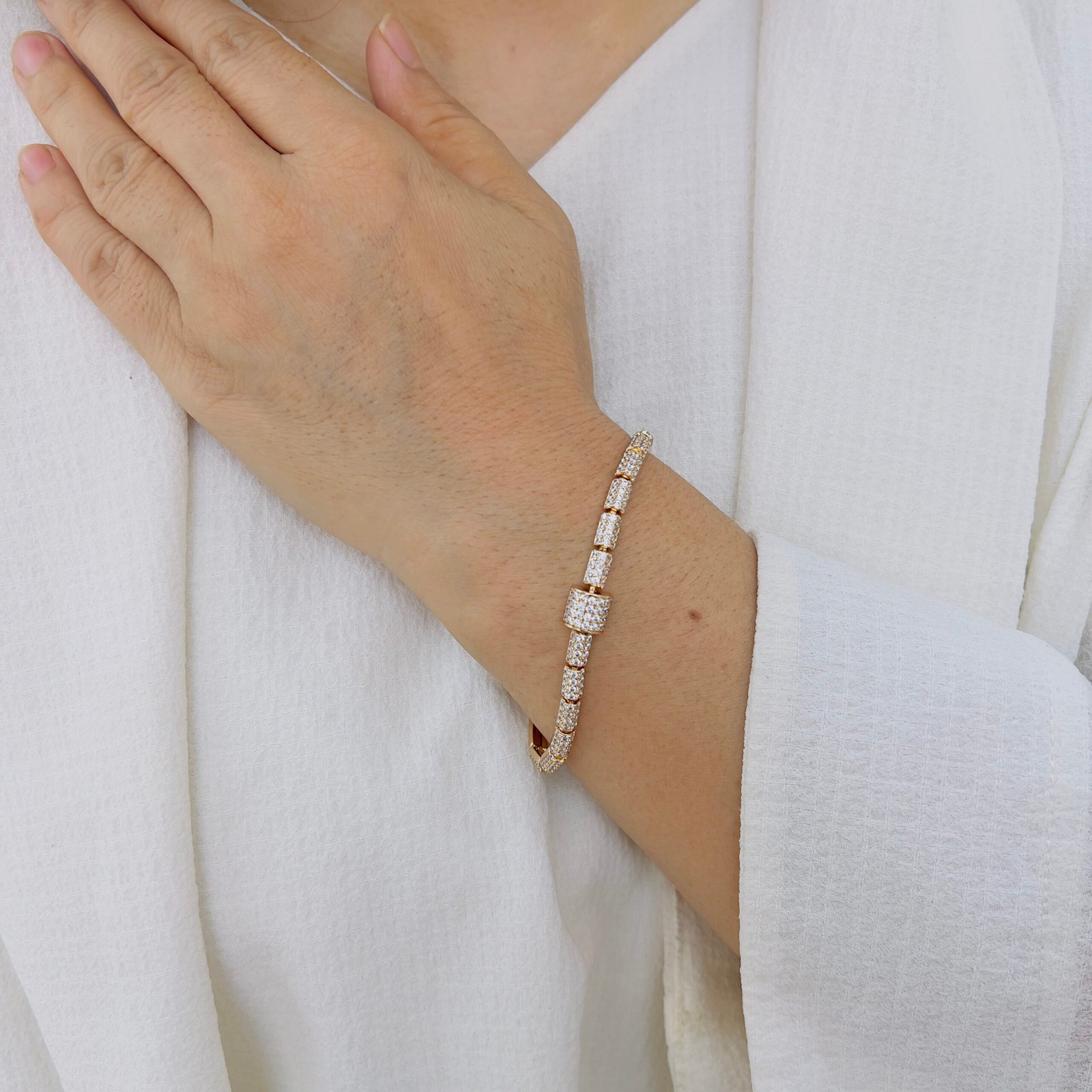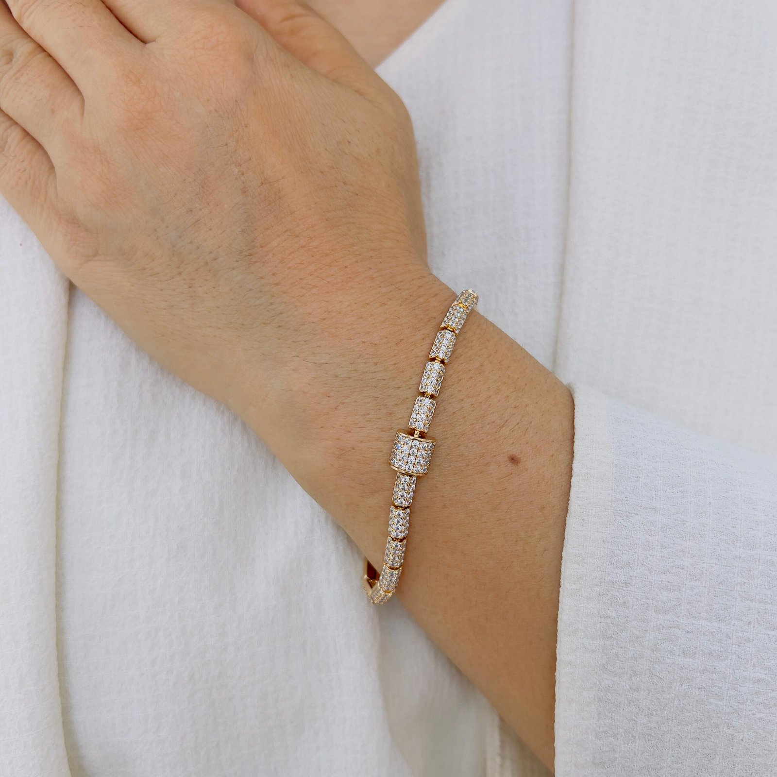 Redefine your workday wardrobe with a touch of brilliance. This sleek, cylindrical link bracelet is meticulously crafted with 18k gold plating and pavé-set stones for a look that is both understated and high-end. Designed specifically for daily wear, its lightweight feel and secure fit make it the perfect companion for the office, seamlessly transitioning from morning meetings to evening dinners.