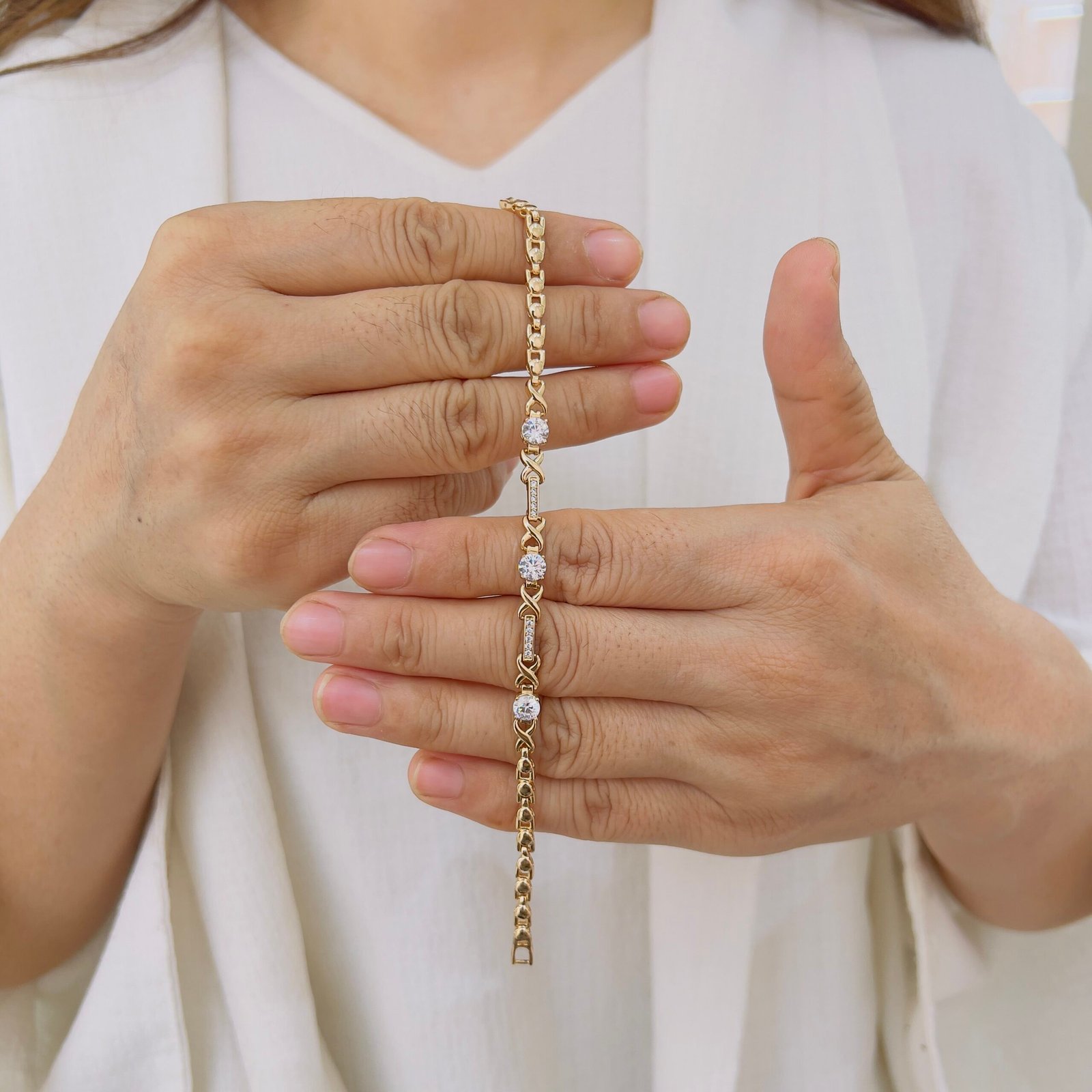 Seal your style with a kiss! This stunning “Hugs and Kisses” link bracelet is a timeless addition to any jewelry box. Dipped in premium 18k gold and featuring brilliant round-cut stones, it’s the perfect blend of romance and luxury. Whether you’re dressing up for a special event or adding a polished touch to your office wear, this piece is designed to shine through it all.