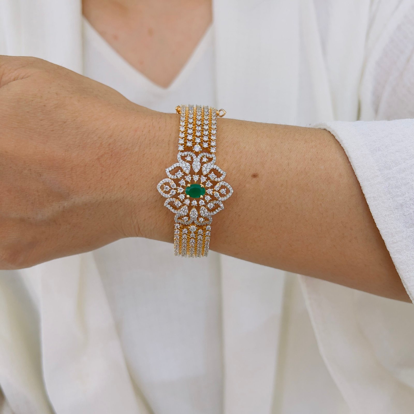 Crafted with premium 18k gold plating, this shiny bracelet is adorned with elegant American diamond stones, Perfect for daily use, it balances durability with refined beauty, making it suitable for both work and casual occasions.
