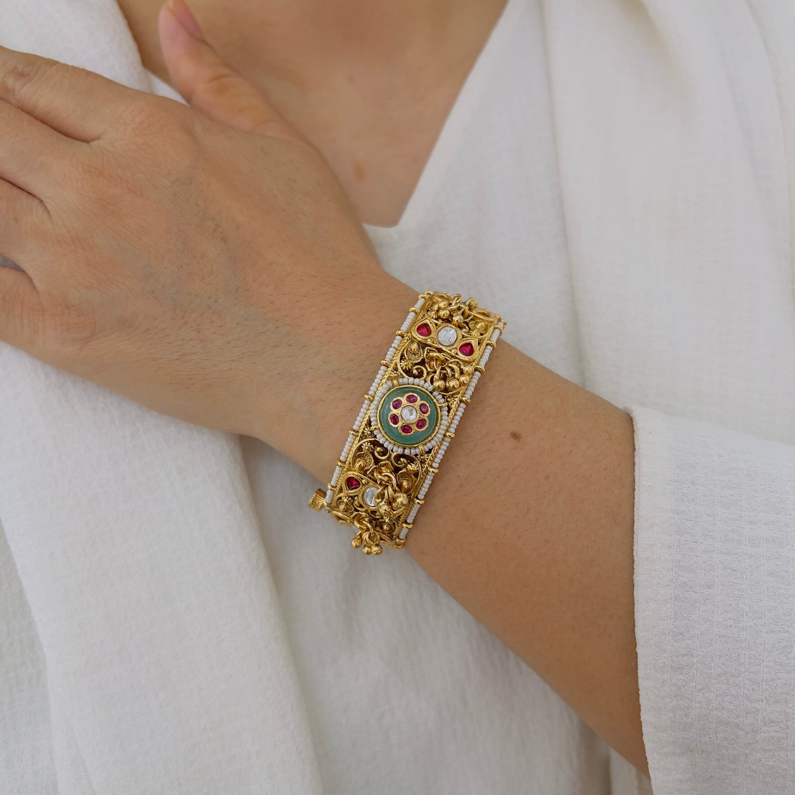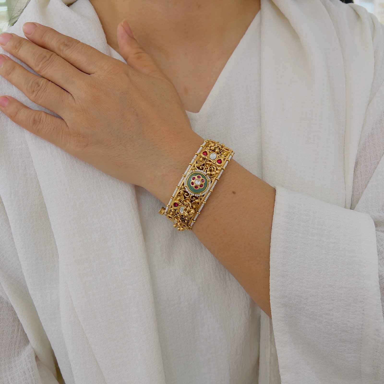 Crafted to reflect the beauty of classic temple artistry, these bangles blend heritage detailing with refined elegance, making them a versatile choice for festive and traditional occasions.