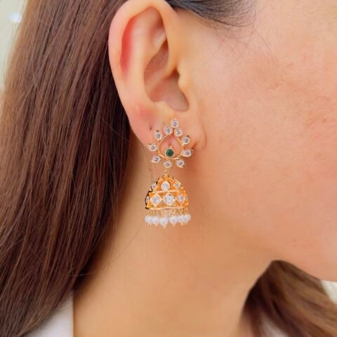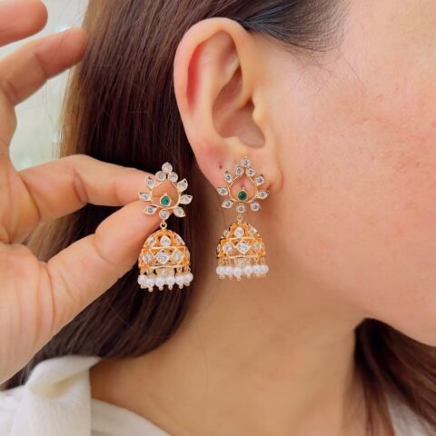 Add a touch of heritage to your style with these intricately designed jhumkas, The radiant stones and delicate pearl detailing create a stunning balance of elegance and tradition.