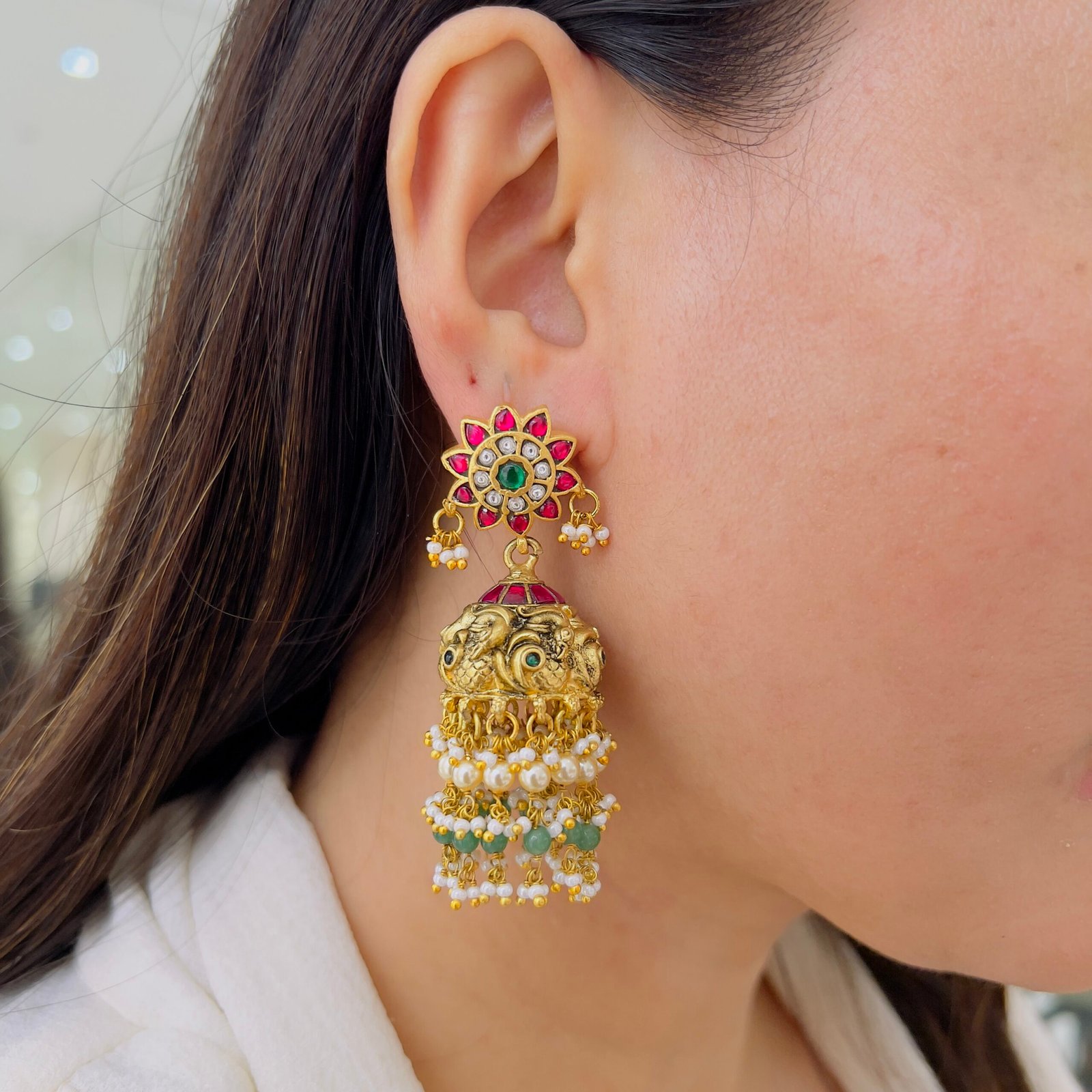 Traditional Jadau Jhumka Earrings with Ruby Stones and Pearls