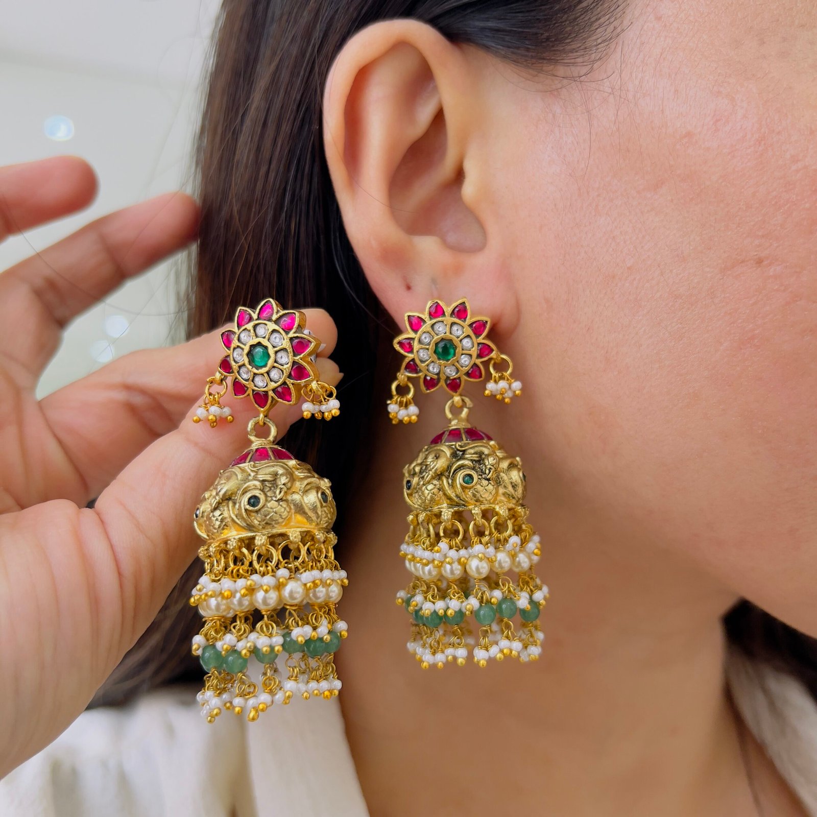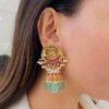 Embrace regal charm with these Traditional Jadau Jhumka earrings, crafted with 18K gold plating, anti-tarnish polish, and shiny stones, Perfect for rough use and festive wear, they bring timeless Indian artistry to your collection.