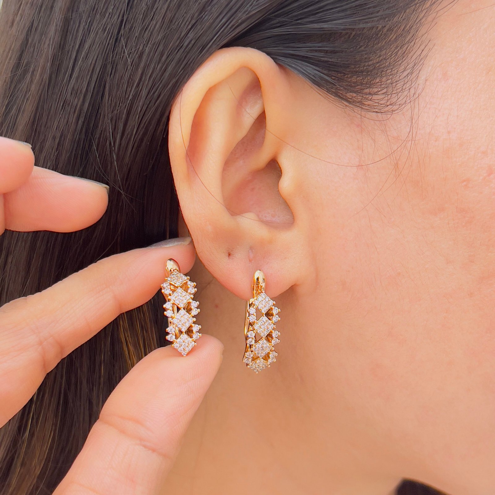 Add a touch of class to your daily look with these 18k Gold-Plated Earrings, Anti-Tarnish, durable for rough use, and adorned with shiny stones.