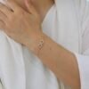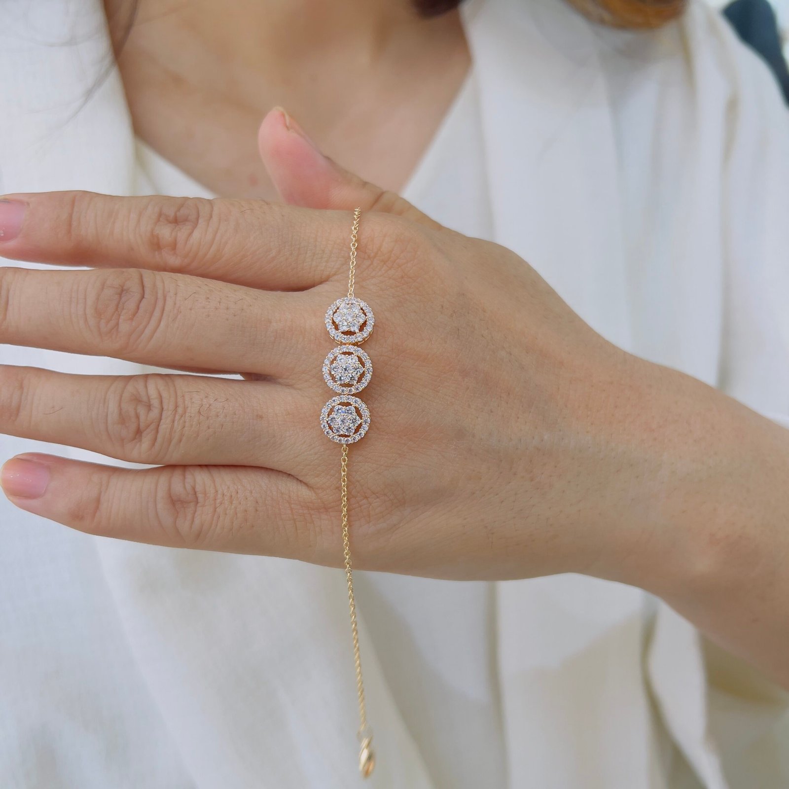 Add timeless sophistication to your look with this elegant bracelet featuring three shimmering halo motifs, Crafted with 18K gold plating, anti-tarnish coating, and adjustable fit, it’s perfect for both daily wear and festive occasions. Elegant, durable, and radiant always.