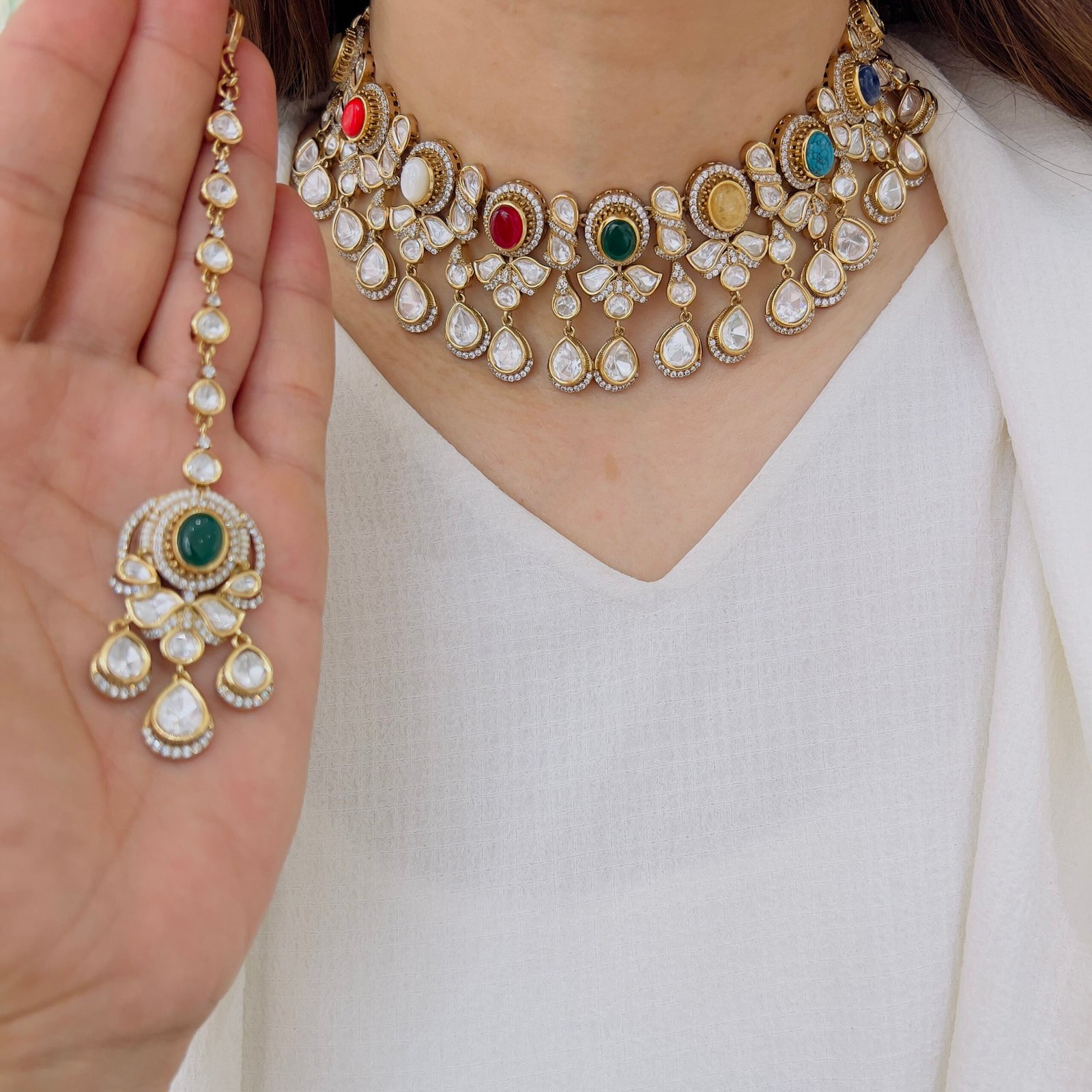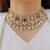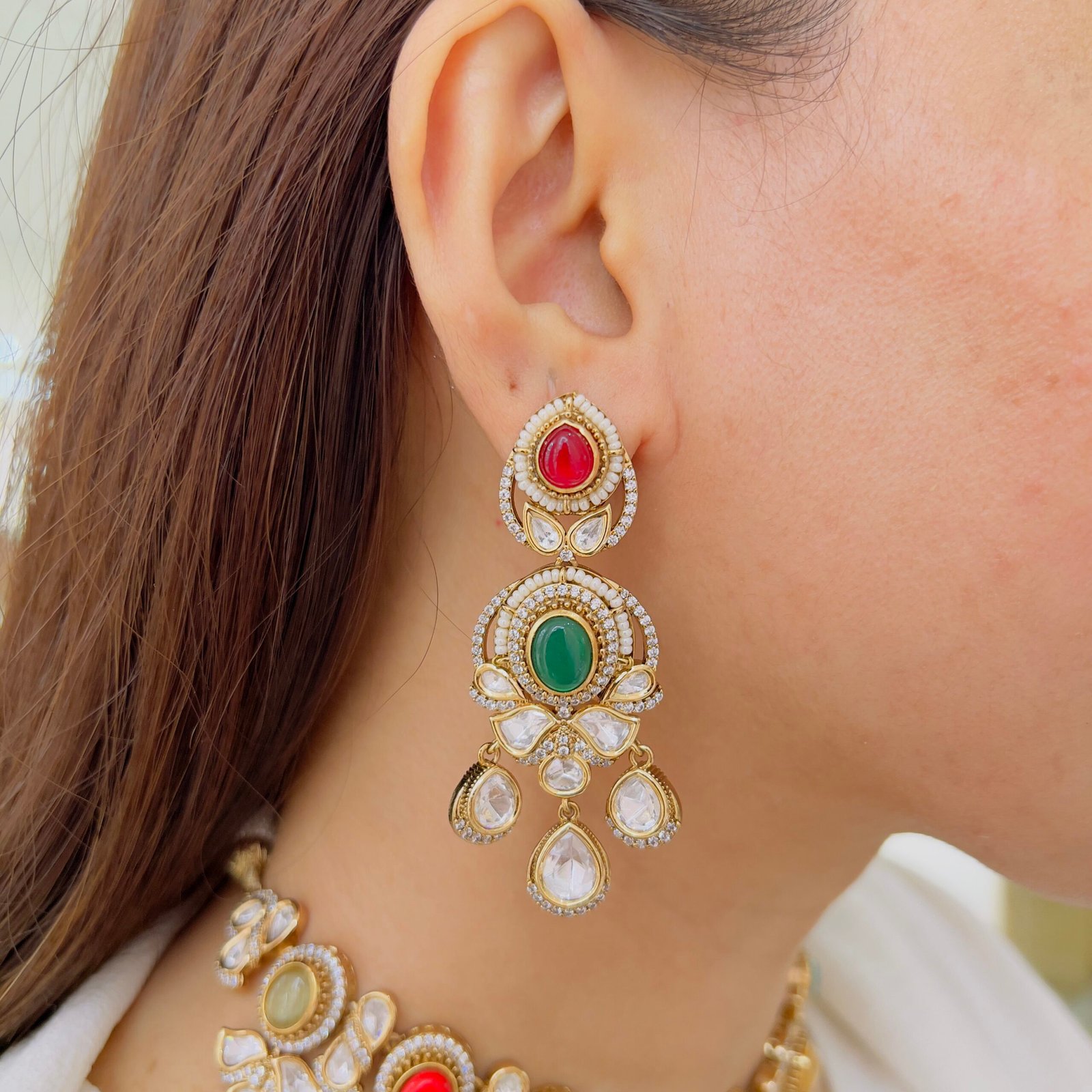 A richly detailed Victorian necklace set featuring vibrant oval stones framed with kundan-style petals and elegant drop hangings. Perfectly crafted to create a regal and eye-catching statement for weddings and festive occasions.